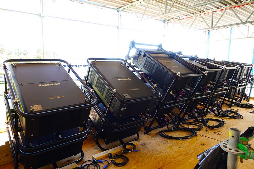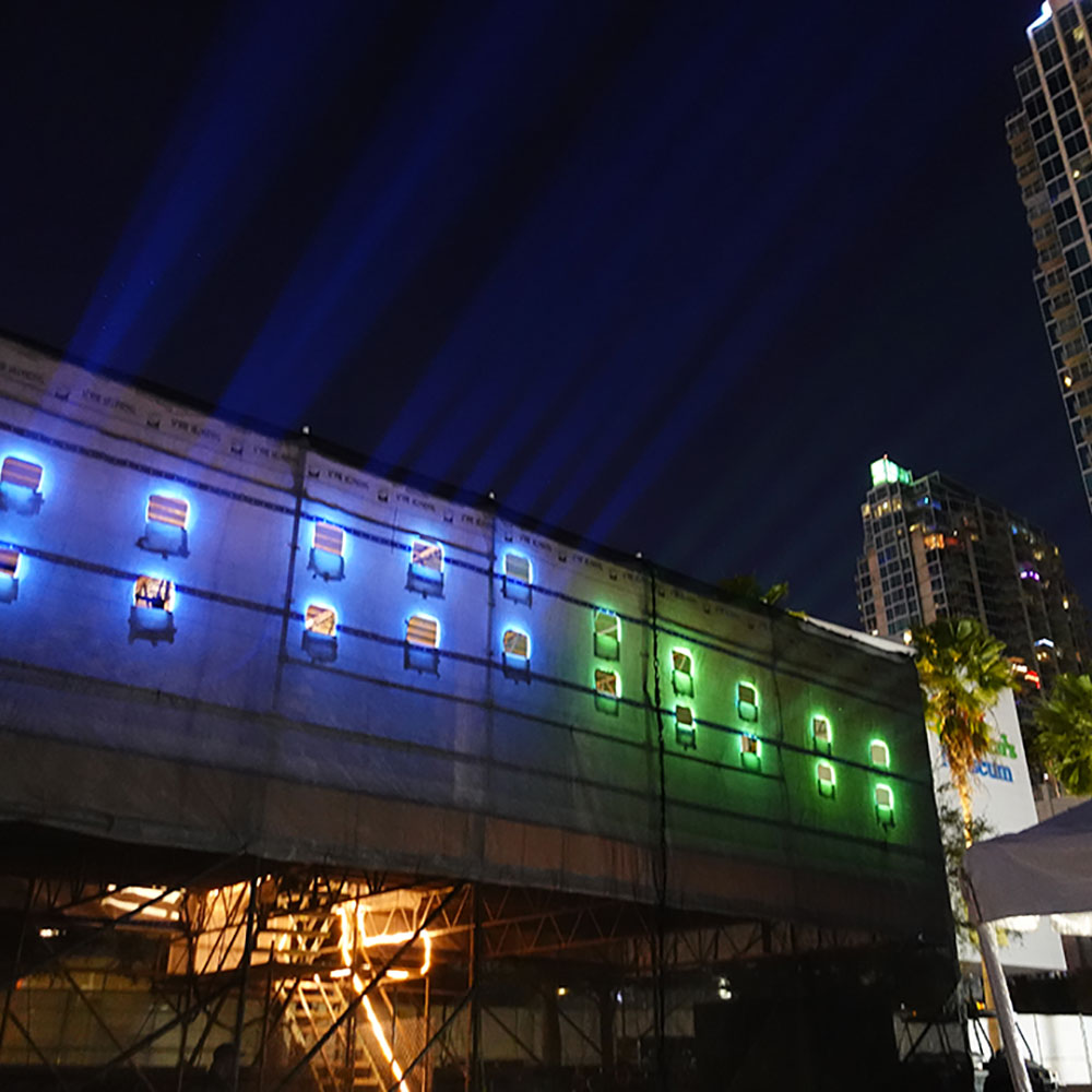 We erected a “Treehouse” at the opposite end of the Curtix Hixon Waterfront Park to house all 20 of the Panasonic 31k projectors. This casted a stunning 600,000 lumen image that was over 160 feet wide and 200 feet tall! The vivid imagery covered thirty floors of the building and could be seen from all across the city.
