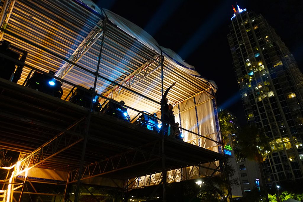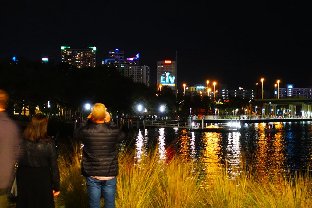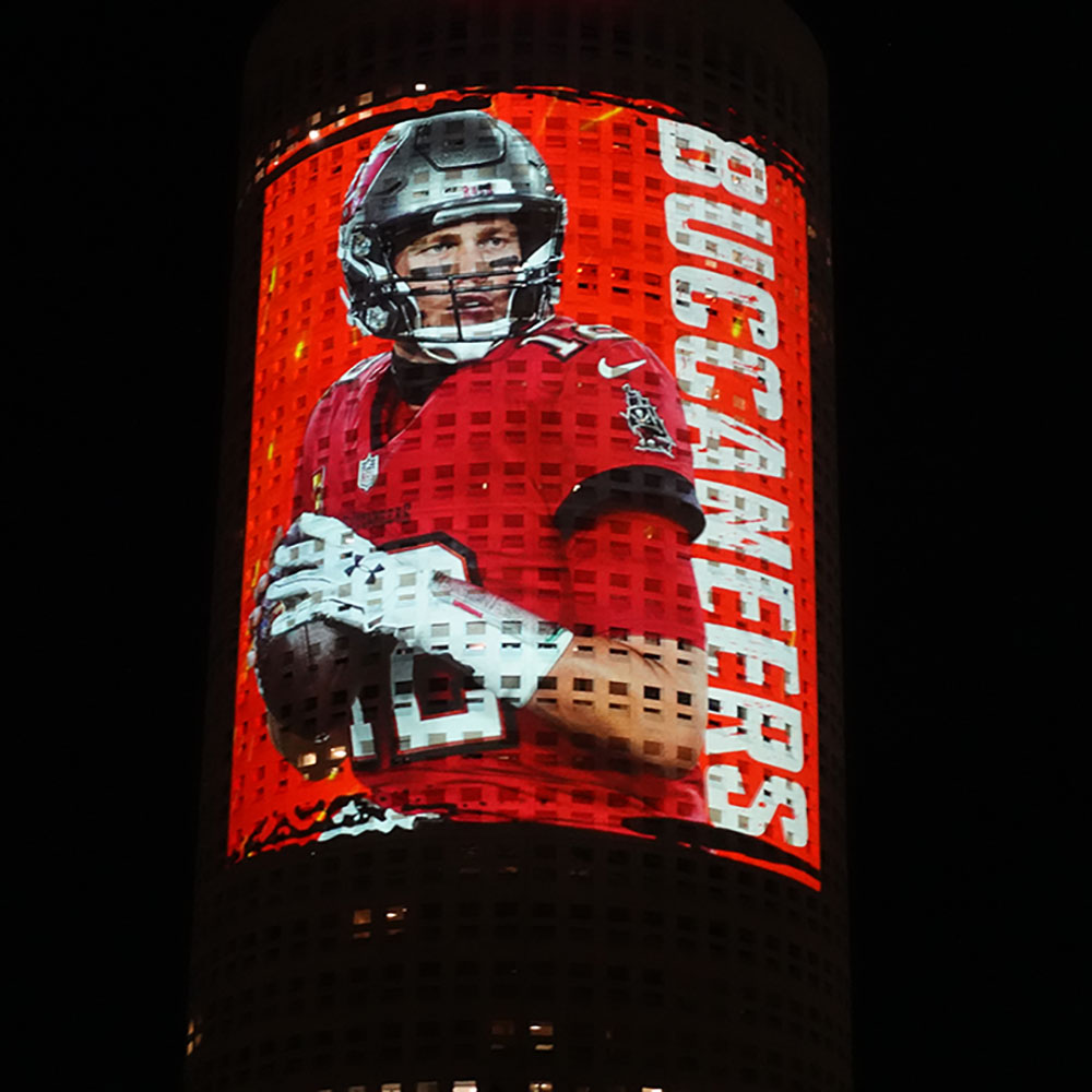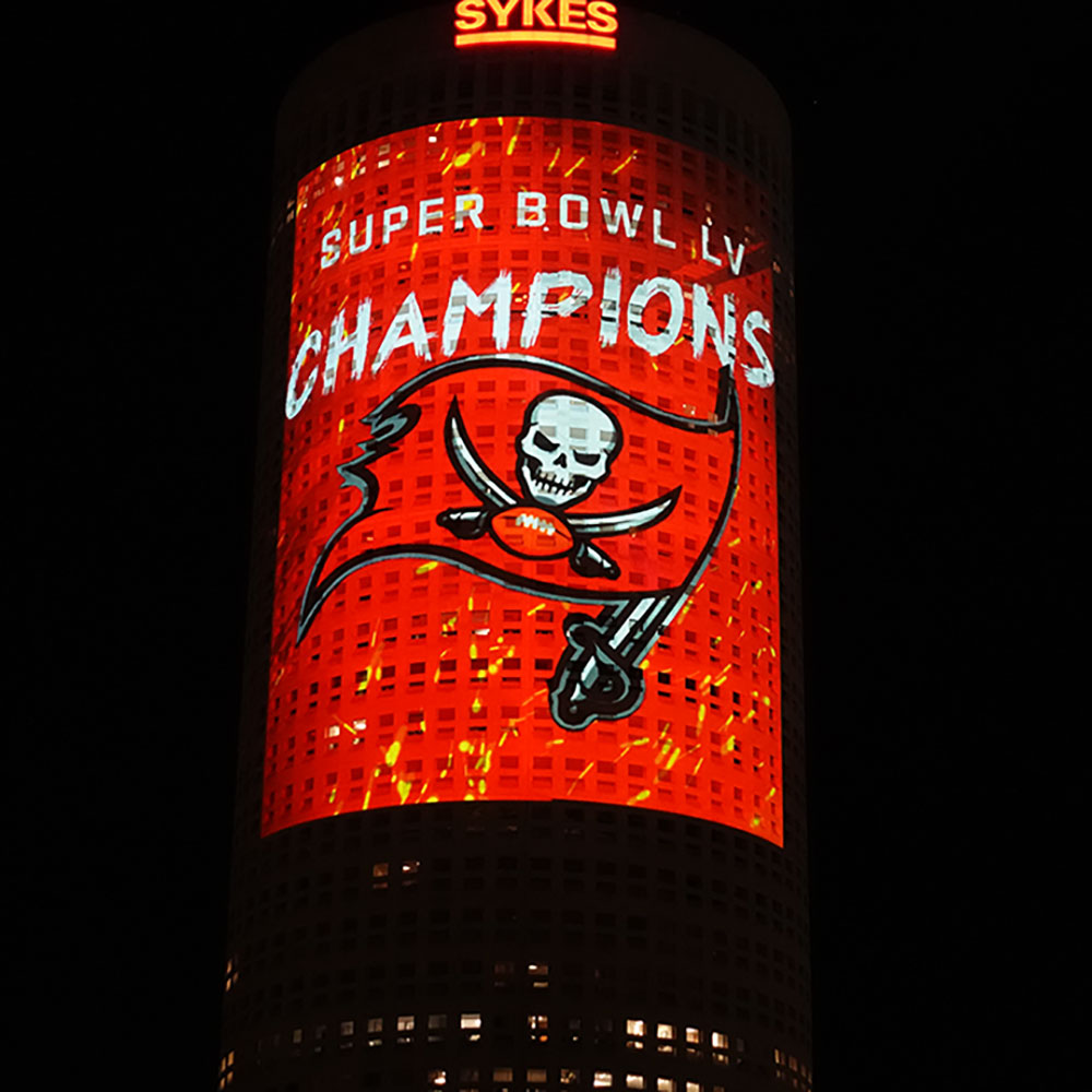 Our second show took place at the Embassy Suites hotel in the heart of the channel district downtown. The architecture of this location allowed for a mesmerizing mirror effect across the twin columns that the building divides into thanks to an entirely windowless side of the building facing inland. Building up to the big game they displayed a set of shimmering banners promoting Super Bowl LV. As soon as we displayed the dynamic Super Bowl Champion banners at the conclusion of Tampa Bay’s historic victory the whole district erupted into a giant outdoor party!