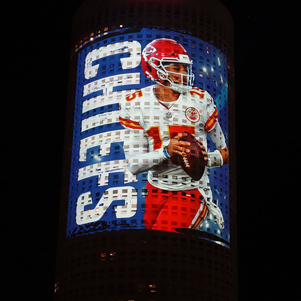 The timing of this year’s Super Bowl made for some interesting logistics. Chief among them, how to deliver an immersive shared environment while still in the throes of a pandemic? Due to social distancing constraints and a peripheral location, projection mapping the stadium was not a viable option. Instead, we found a beautiful limestone canvas in the form of the Rivergate Tower for our main show.