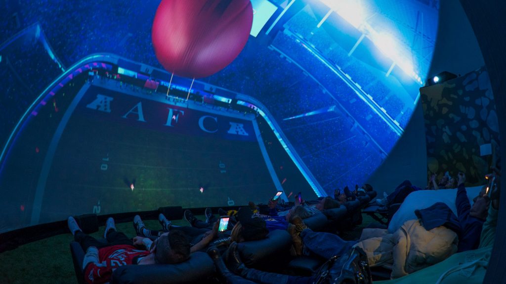 Marriott’s courtyard suite just got a lot sweeter with the new experiential marketing technology for the Marriott Super Bowl Sleepover Dome Experience provided by bluemedia and Omnispace! Fans got a sneak peek along with Pro Athletes and a select few of lucky fans inside our 40’(12m) furnished projection dome filled to the brim with exclusive immersive art and 4k fulldome projections!
